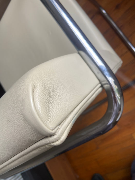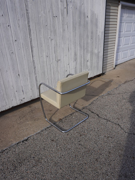 The slick and sexy design of this chrome chair is by Mies van der Rohe. A world-recognized pioneer of modern architecture. He has plenty of iconic buildings all around Chicago. This was the first piece of furniture I ever bought for my room in college. I asked my cousin who has studied Product Design to ID it. The chair is made in Italy. It’s a high quality vintage reproduction. Finishes are stainless steel and faux cream leather. I've had it for 6 years in my room and I never really sat on it. It's just sweet.